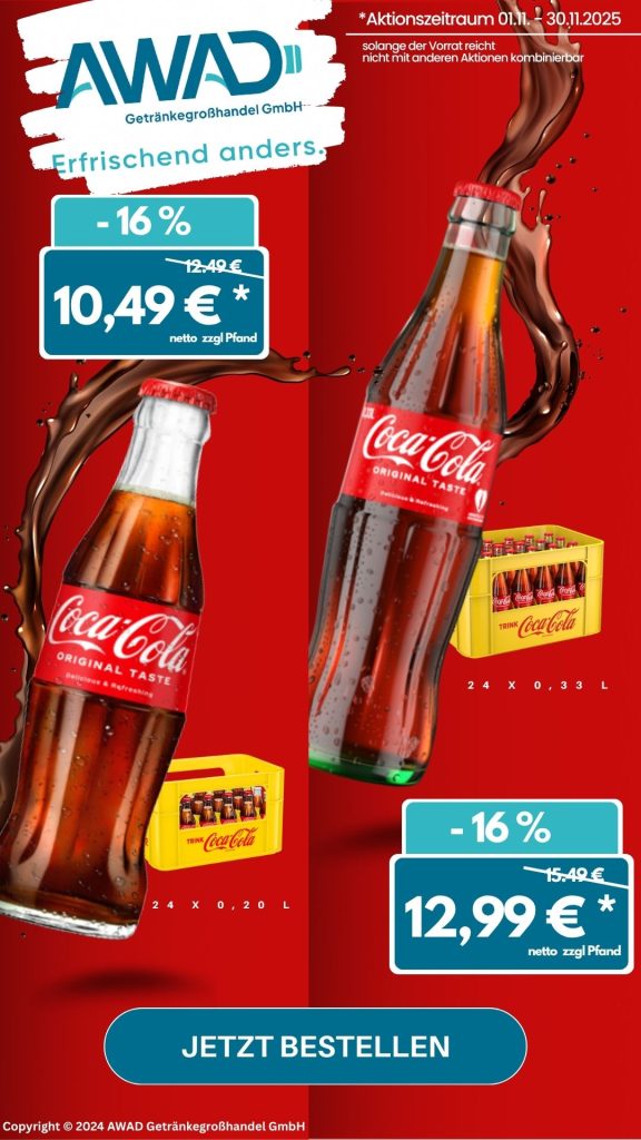 Gültig vom 01.11. – 30.11.2025 für alle Coca-Cola Sorten. Nur solange der Vorrat reicht. Aktion ist mit anderen Aktionen nicht kombinierbar.